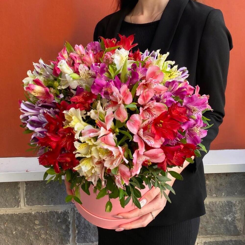 Альстромерия – 25 шт.Оазис флористический – 1 шт.шляпная коробка l – 1 шт.