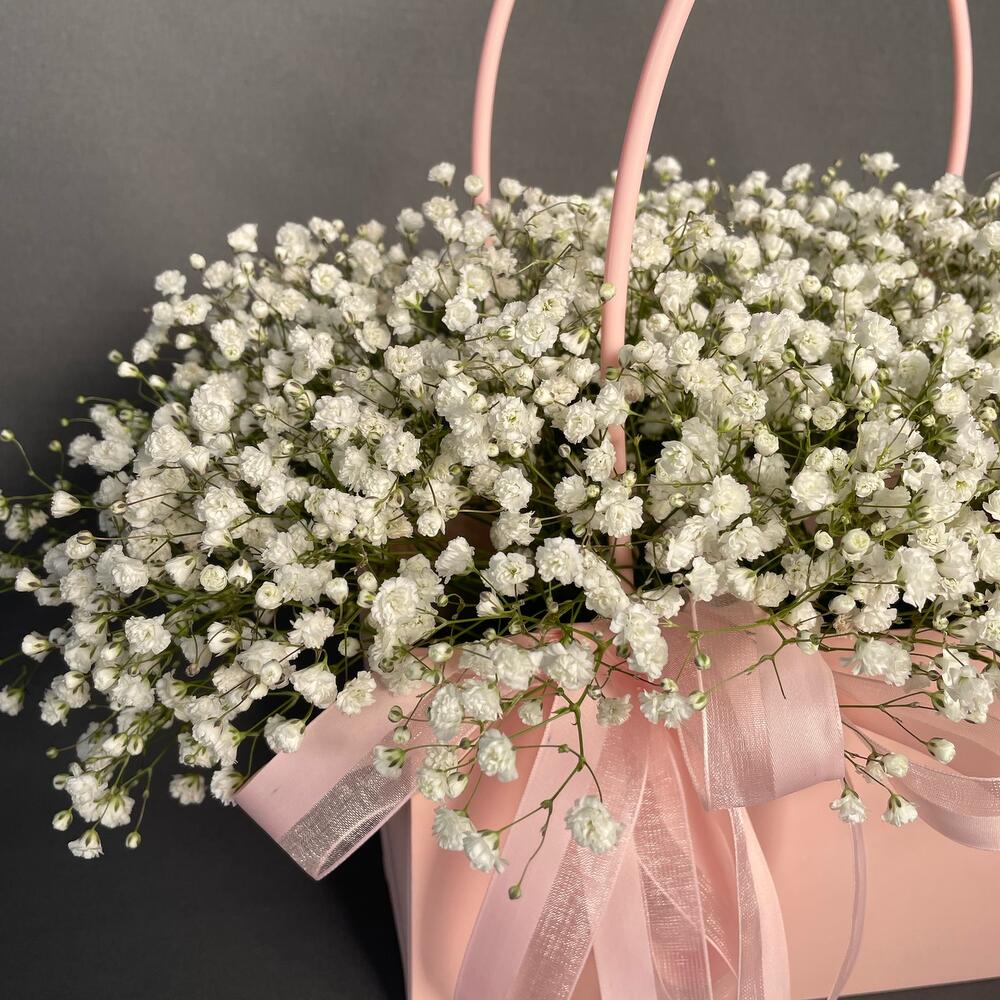 гипсофила белая – 5 шт.Сумочка картонная – 1 шт.Оазис флористический – 1 шт.Лента атласная – 1 шт.