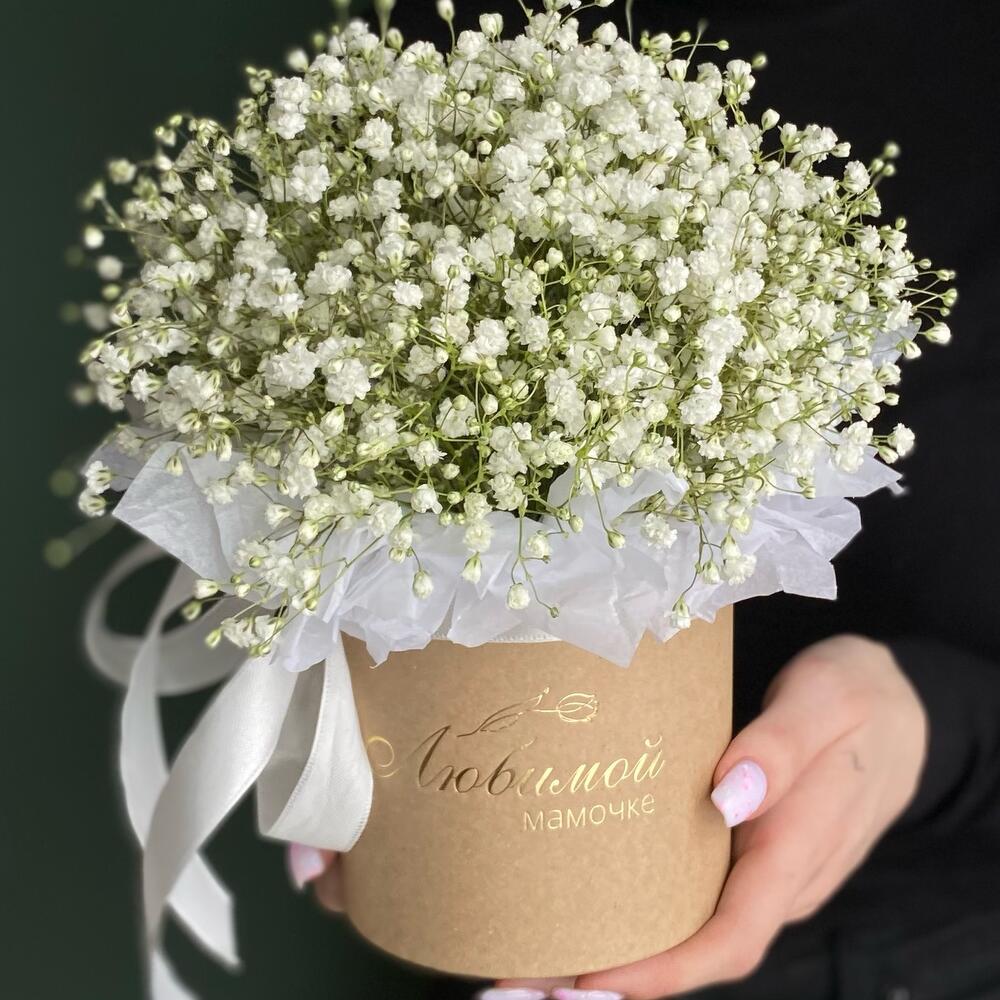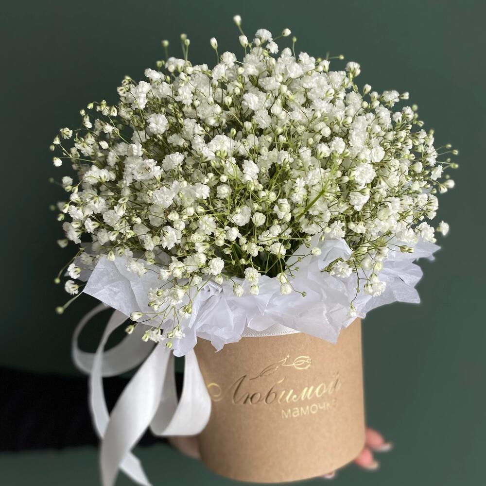 “Сиреневый туман” – композиция из гипсофилы в шляпной коробке