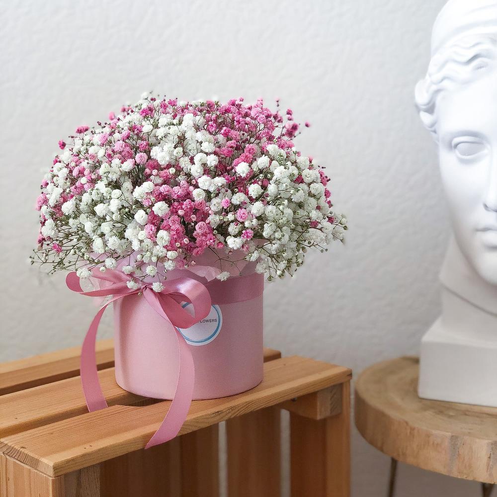 Гипсофила – 5 шт.Коробка шляпная – 1 шт.Лента атласная – 1 шт.Губка флористическая – 1 шт.
