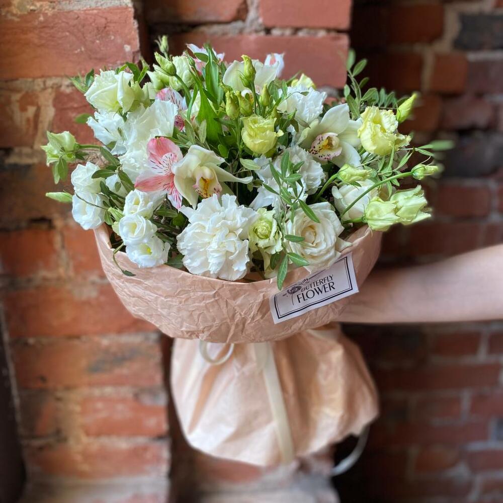 Букет из эустомы, гвоздики, цимбидиума, роз и альстромерии в дизайнерской упаковке “Белая сакура”