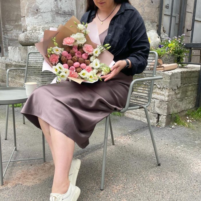 эустома белая – 6 шт.диантус нежно розовый – 5 шт.свежая клубника в бельгийском шоколаде – 450 гр.