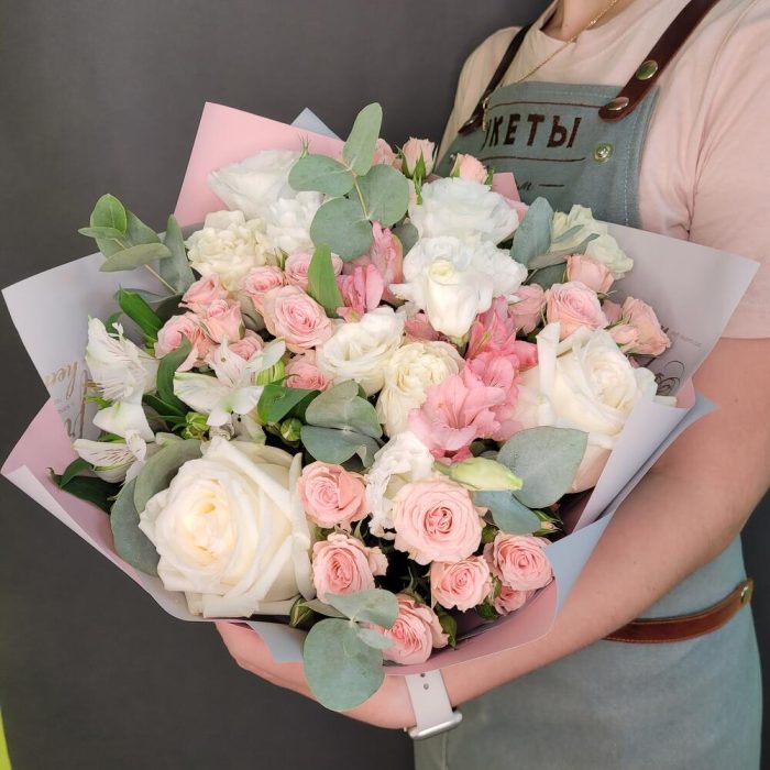 роза канделайт – 3 шт.Роза Мондиаль – 2 шт.Диантус – 4 шт.Альстромерия – 4 шт.Роза кустовая – 3 шт.эвкалипт ветка большая – 2 шт.Упаковка дизайнерская – 2 шт.