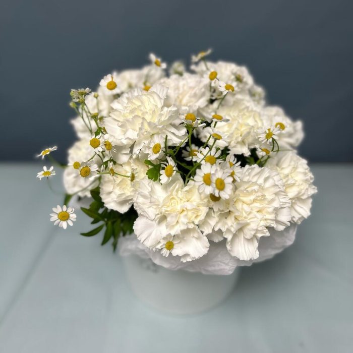 Гвоздика – 15 шт.Тишью – 1 шт.Матрикария – 2 шт.Коробка – 1 шт.Оазис флористический – 1 шт.