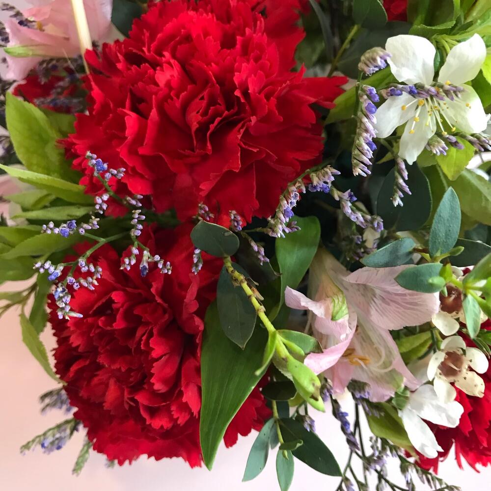 Альстромерия – 1 шт.Ваксфлауэр – 1 шт.Лимониум – 2 шт.Гвоздика – 8 шт.фисташка зелень – 22 шт.