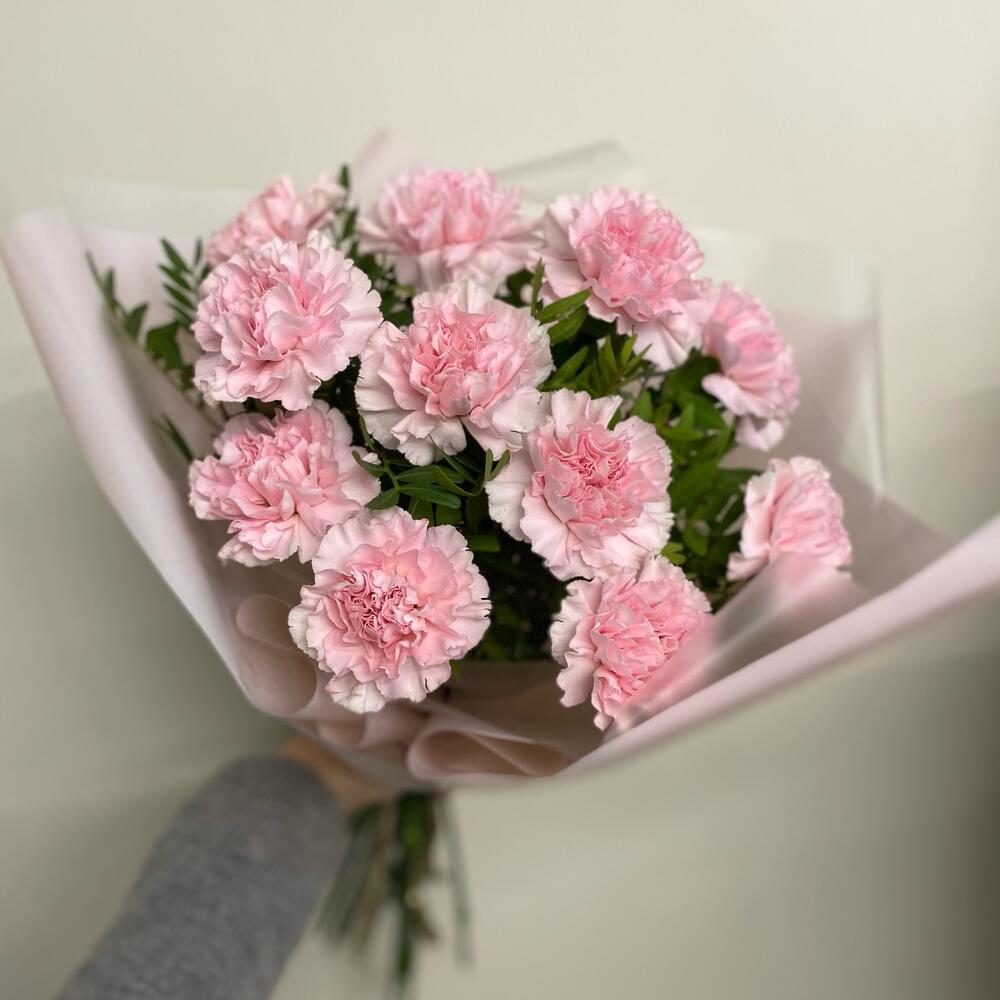 Зелень – 5 шт.Лента атласная – 3 шт.Упаковка дизайнерская – 4 шт.диантус сортовой гвоздика – 11 шт.