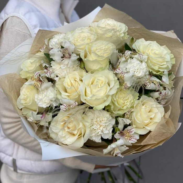 роза одноголовая mondial – 11 шт.Альстромерия – 5 шт.Диантус – 5 шт.Подарочная упаковка – 1 шт.средство для продления жизни срезанных цветов – 1 шт.
