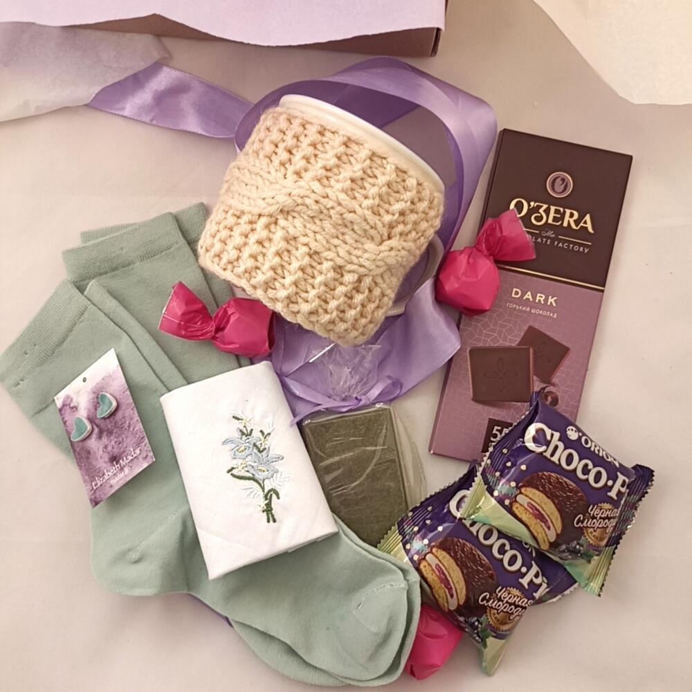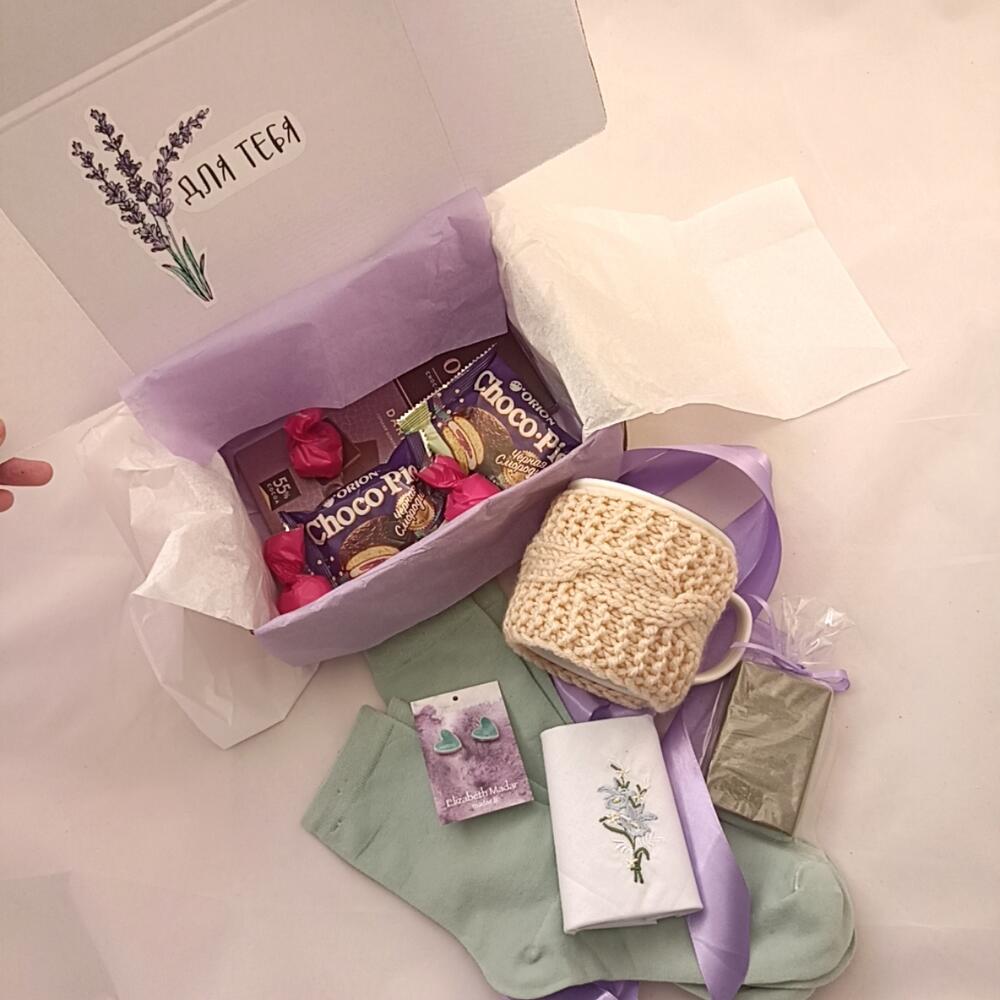 Оригинальный подарочный набор с тем, что может удивить и порадовать любимого человека ❤В подарочный бокс входит:- Керамическая кружка белого цвета (300мл) с вязаным вручную бежевым свитерком (снимается); уютная деталь не помешает чаепитию, верхняя часть кружки свободна)- Сережки-сердечки голубого цвета из специальной легкой глины, вес которой не ощущается при носке- Хлопковый платочек белого цвета с вышивкой цветов- Аирное мыло для ухода за проблемной кожей- Хлопковые носочки (2 пары)- Шоколадные конфеты (3 шт)- Темный (горький) шоколад с 55% какао в составе (1 шт)- Choco-Pie с черной смородиной (2шт)Набор упакован в подарочную упаковку лавандового цвета и крафтовую коробку с рисунком лаванды и надписью «Для тебя» внутри ❤Наши необычные подарки придутся по душе каждой дочке, жене, маме, бабушке, любимой девушке или коллеге. Также поможем удивить отцов, дедушек, сыновей или внуков. Ведь пол и роль не важны, зато бывает так важно подарить чуточку внимания и тепла) А у нас есть все, чтобы Вам с этим помочь ❤Вы можете изменить состав подарочного бокса: -добавить открытку в конверте или без, в которой мы напишем Ваше позд