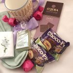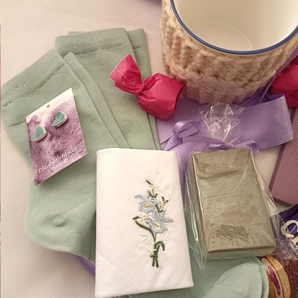 Подарочная упаковка – 1 шт.Шоколадные конфеты – 3 шт.Мыло ручной работы – 1 шт.Чокопай – 2 шт.темный шоколад – 1 шт.керамическая кружка – 1 шт.носовой платок – 1 шт.серьги гвоздики – 1 шт.хлопковые носочки – 2 шт.