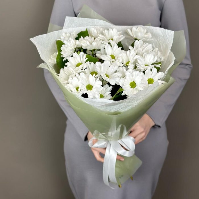 Фисташка – 3 шт.Лента атласная – 1 шт.Упаковка дизайнерская – 1 шт.Хризантема Кустовая Бакарди белая – 5 шт.Тишью белое – 1 шт.