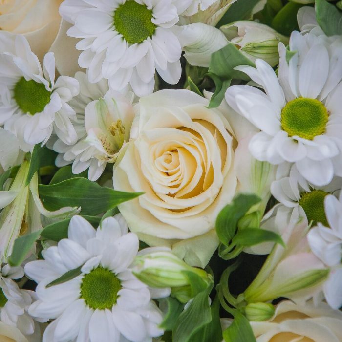 белые розы – 7 шт.белая хризантема – 3 шт.Альстромерия белая – 9 шт.
