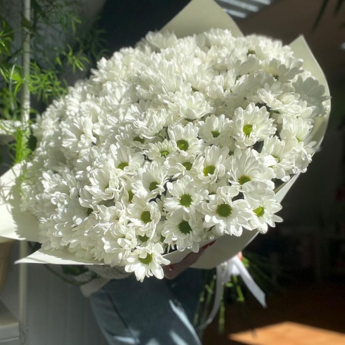 Оригинальный букет из хризантем похожей на ромашку. После срезки этой хризантемы она длительное время сохраняет свою свежесть и стойкость.Хризантема очень изящный, практичный, стойкий цветок, который завоевал необычную популярность на рынке свежесрезанных цветов. Она … Показать ещёсоставляет основу для изготовления легких и романтических букетов. Жемчужно-белые цветы с сердцевиной салатового цвета могут великолепно смотреться как в моно букете, так и в букете с другими цветами.