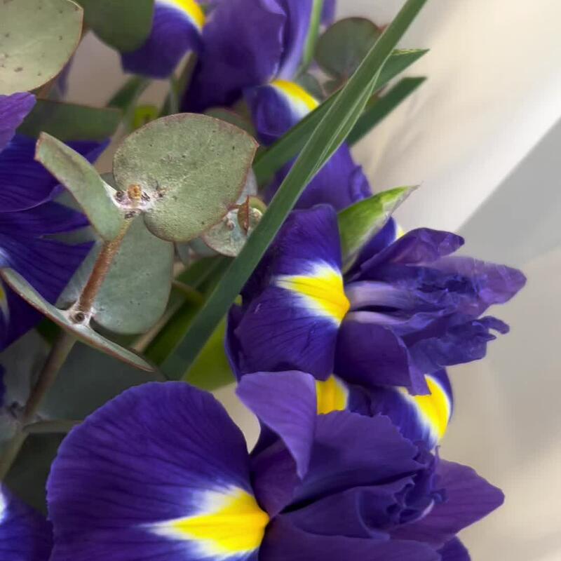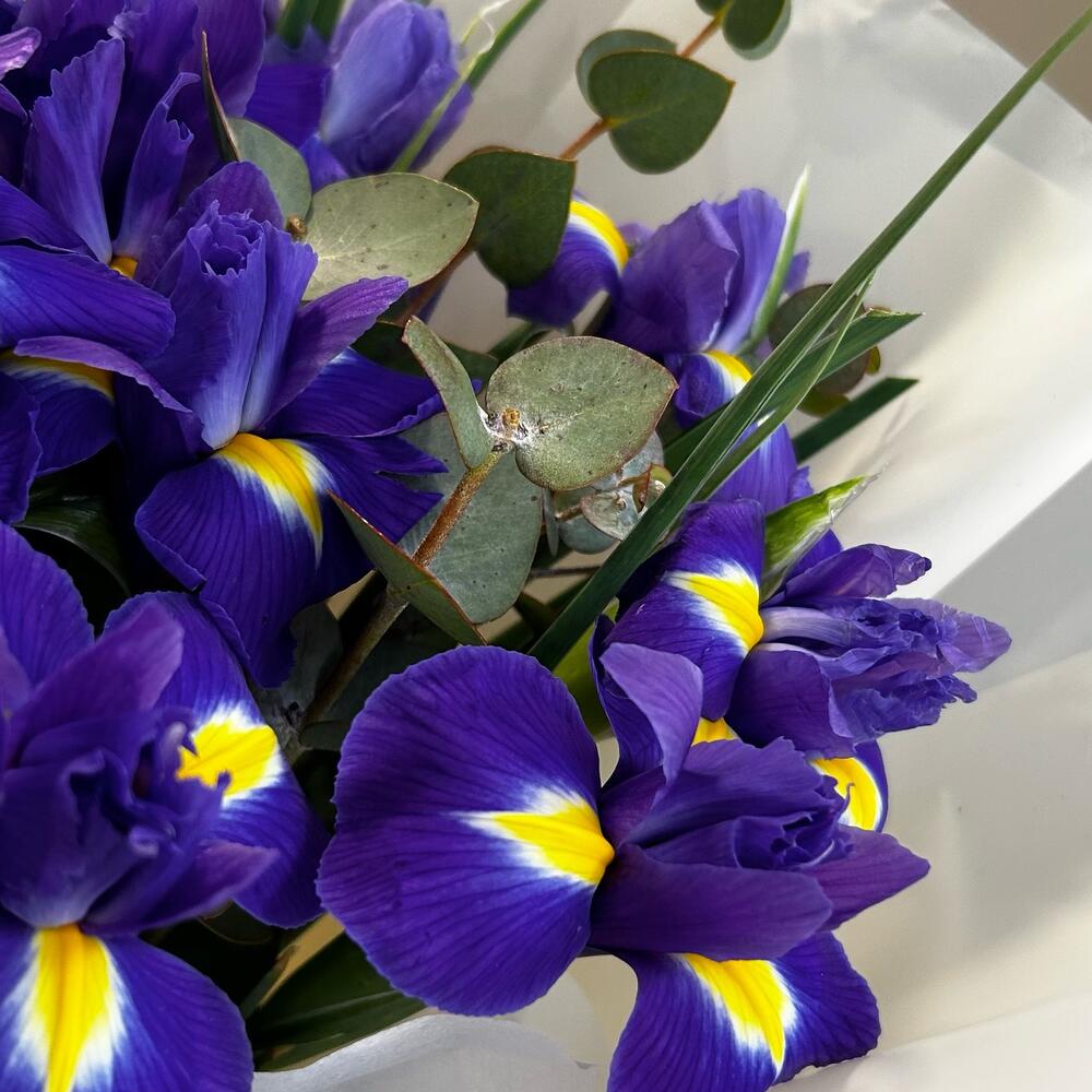 Ирис – 15 шт.Эвкалипт – 2 шт.Лента атласная – 1 шт.Упаковка дизайнерская – 2 шт.