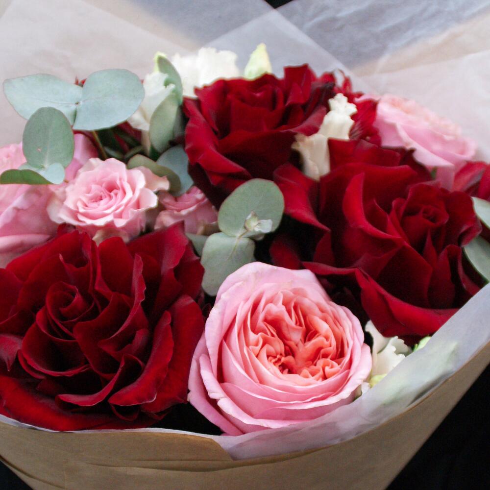 Букет из французских и пионовидных роз с эустомой, кустовой розой и эвкалиптом