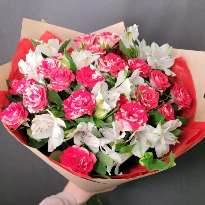 Роза кустовая – 3 шт.Альстромерия Микс Европа – 5 шт.Упаковка дизайнерская – 3 шт.