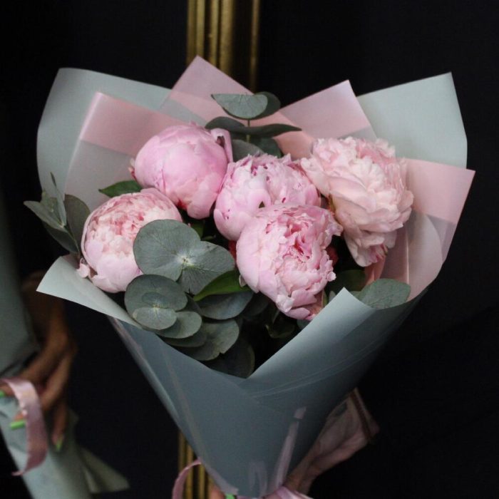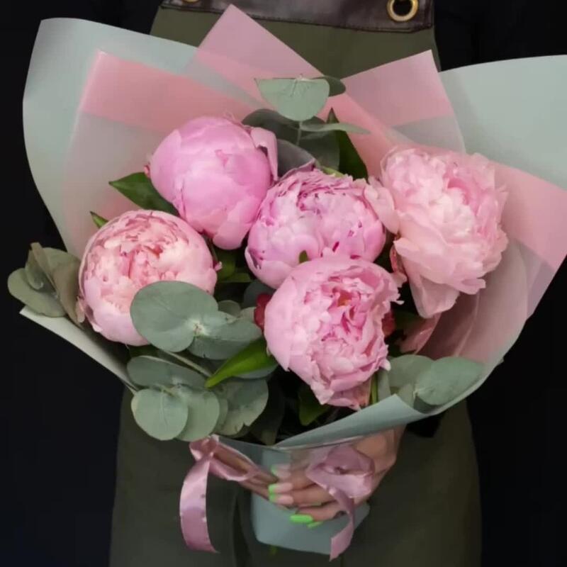 Пион Сара Бернар – 5 шт.Эвкалипт – 3 шт.Пленка матовая – 3 шт.Лента атласная – 2 шт.