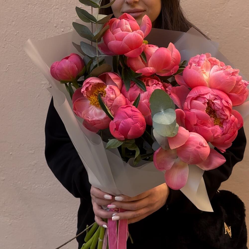 Эвкалипт – 3 шт.Упаковка дизайнерская – 1 шт.пионы coral charm – 9 шт.