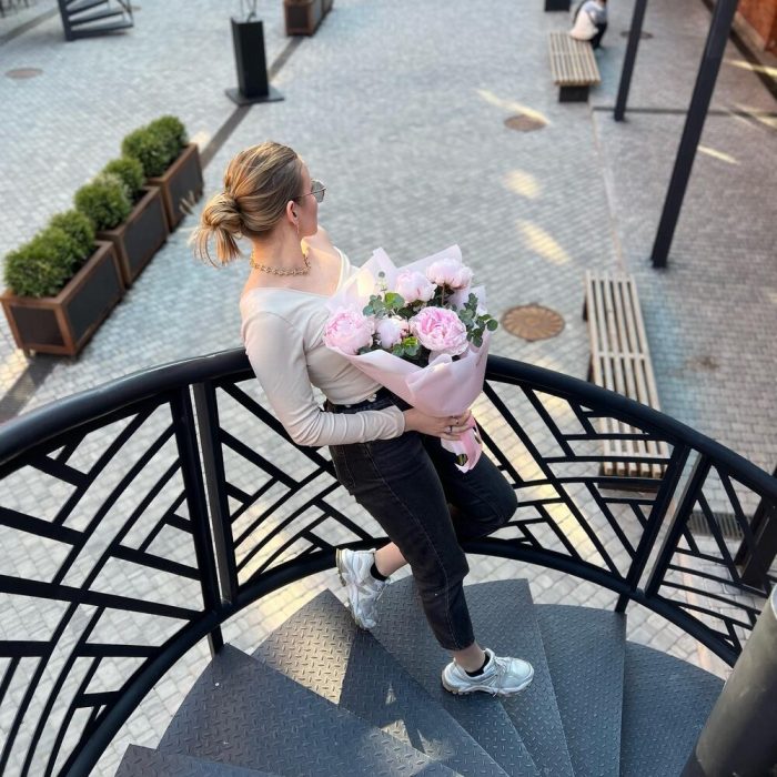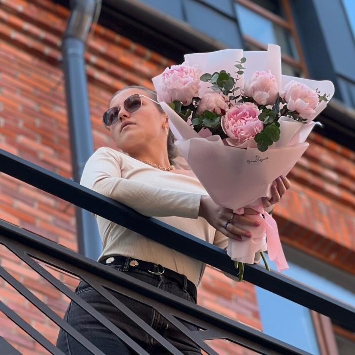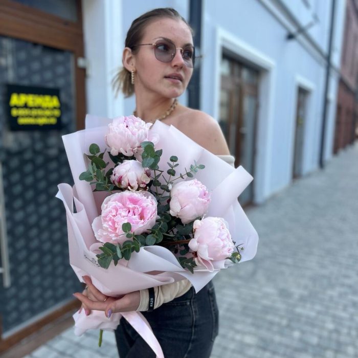 Эвкалипт – 1 шт.Лента атласная – 1 шт.Пион Сара Бернар – 5 шт.Пленка дизайнерская – 2 шт.