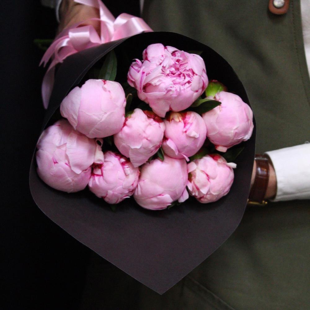 Лента атласная – 2 шт.Пион Сара Бернар – 9 шт.Крафт дизайнерский – 1 шт.