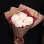 Лента атласная – 1 шт.Пленка дизайнерская – 3 шт.пионы белые – 5 шт.
