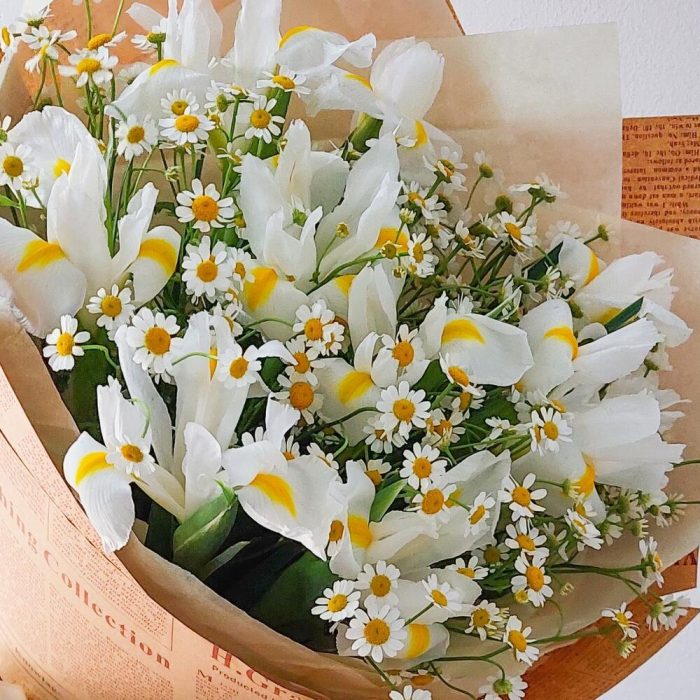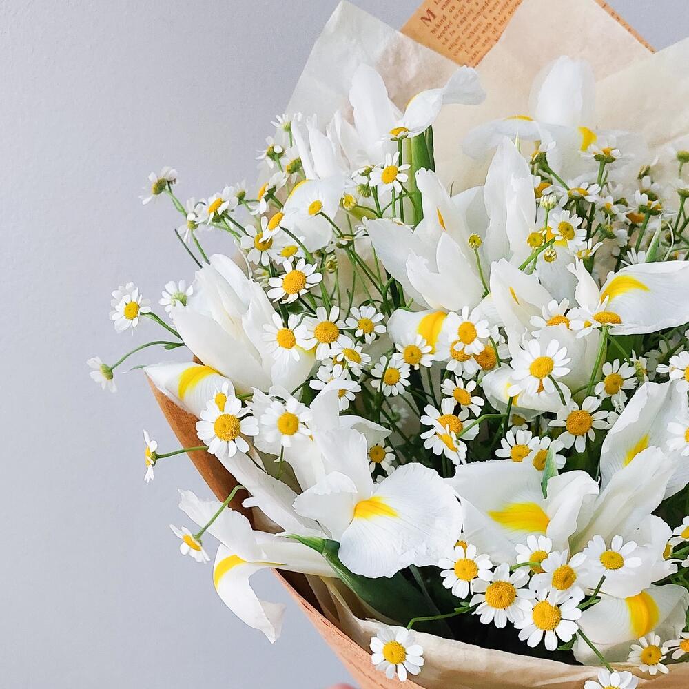 Лента атласная – 1 шт.Тишью – 2 шт.Ирис белый – 9 шт.Открыточка с вашими пожеланиями – 1 шт.бумага крафт – 1 шт.транспортировочная упаковка – 1 шт.ромашка (танацетум) – 8 шт.
