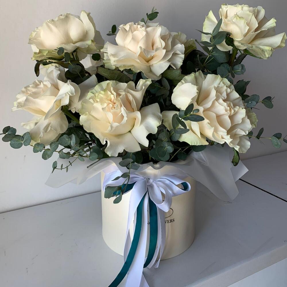 Эвкалипт – 6 шт.Коробка – 1 шт.Роза французская – 7 шт.Оазис флористический – 1 шт.