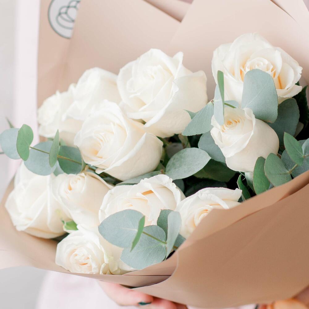 Букет из 11 белых роз (Эквадор) 50 см Vendela с эвкалиптом в кремовой пленке
