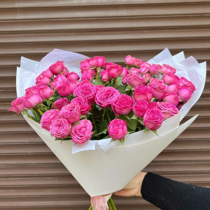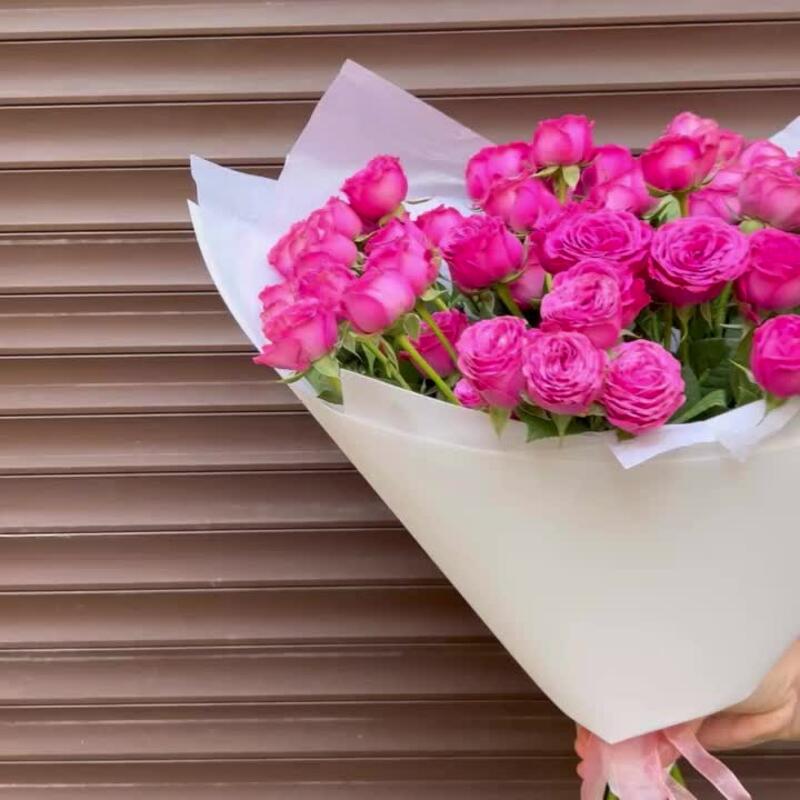 Лента атласная – 1 шт.Пленка матовая – 2 шт.Пионовидная роза кустовая – 15 шт.