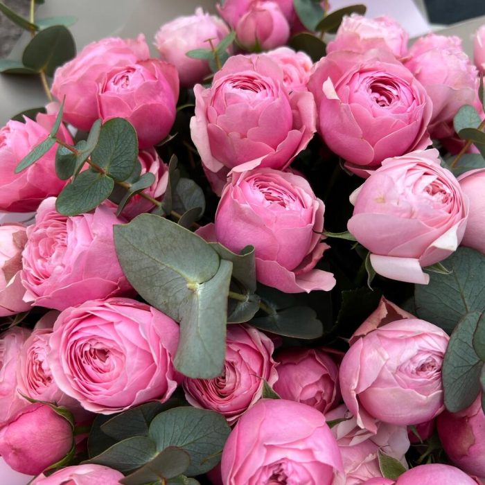 Эвкалипт – 5 шт.Упаковка дизайнерская – 5 шт.Пионовидная кустовая роза – 15 шт.