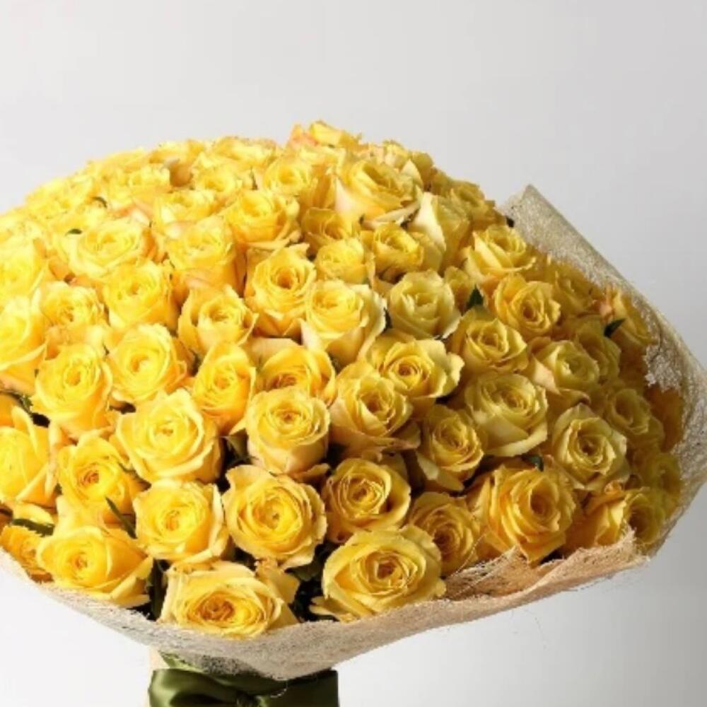 Желтая роза – 51 шт.Упаковка дизайнерская – 1 шт.Лента атласная – 2 шт.Открытка – 1 шт.инструкция по уходу за цветами – 1 шт.хорошее настроение – 100 шт.коробка переноска – 1 шт.Кризал – 1 шт.