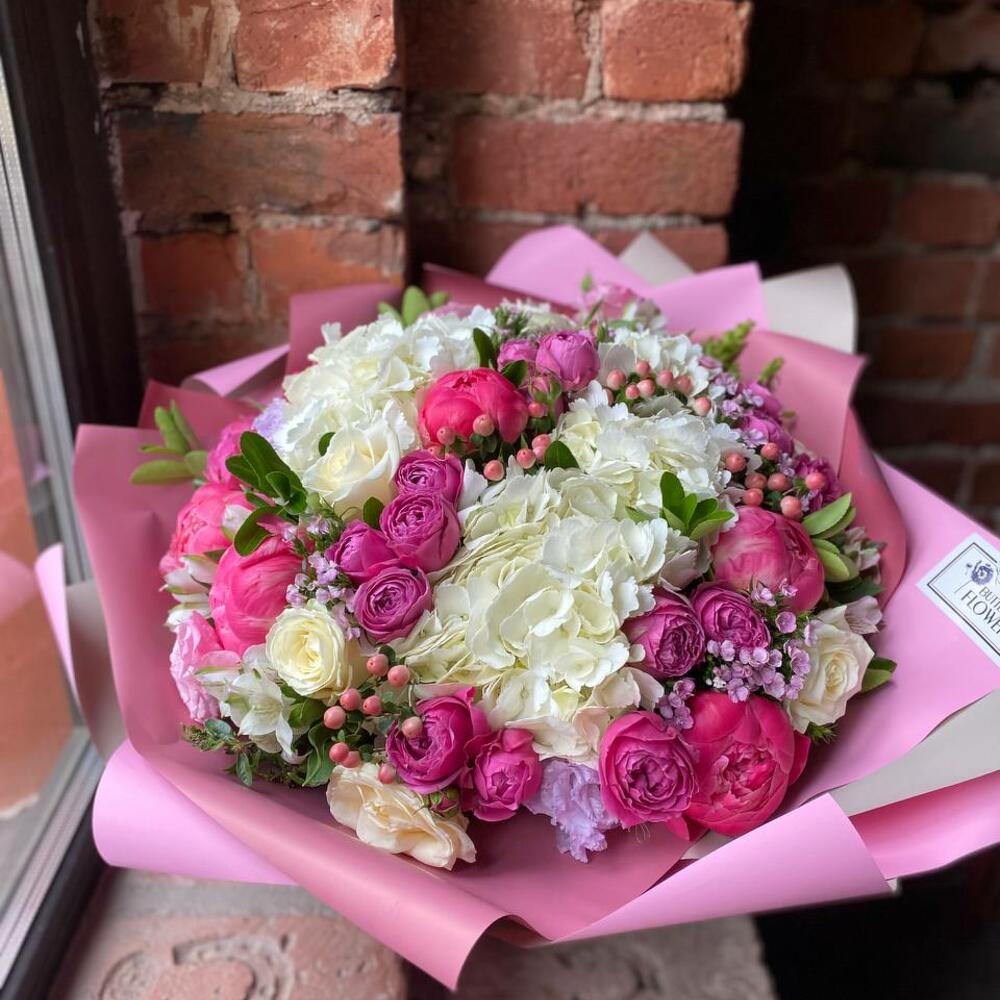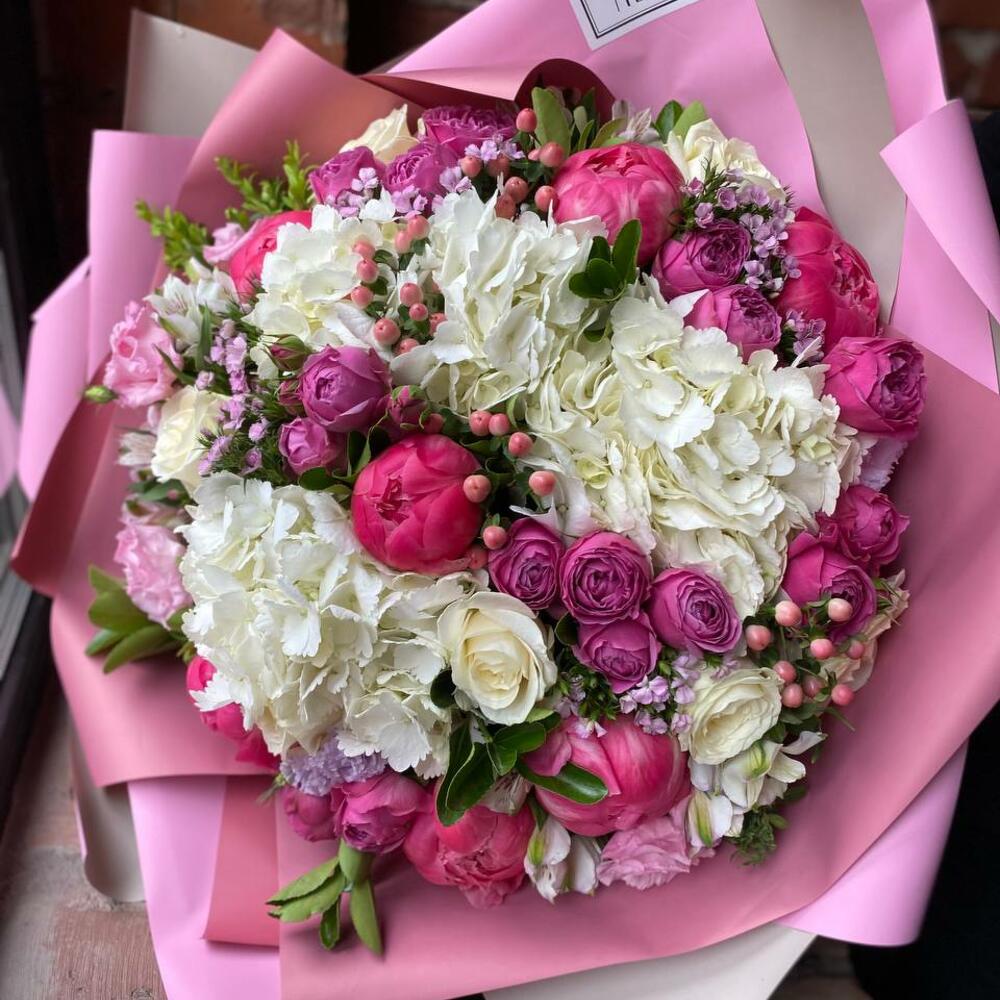 Букет из гортензии, пионов, пионовидной розы, эустомы и роз в стильной упаковке “Американ Роад”