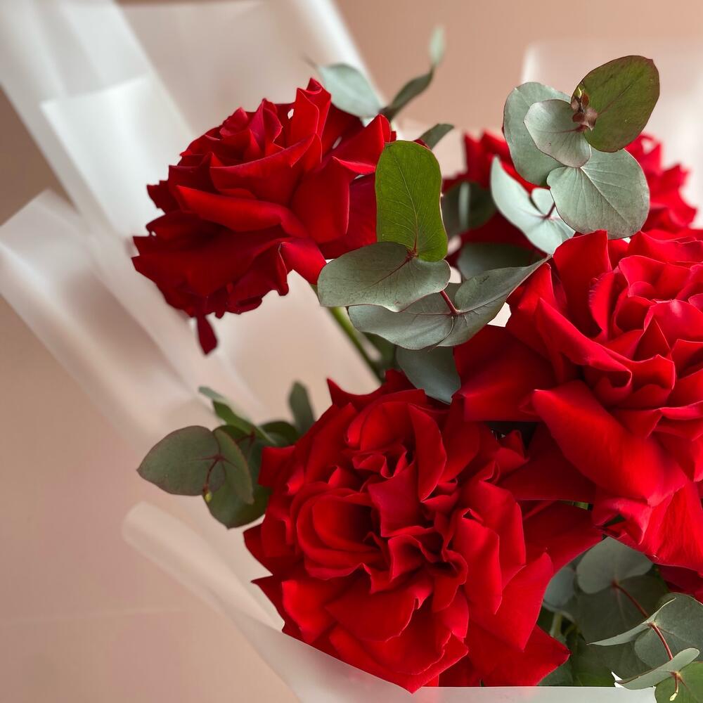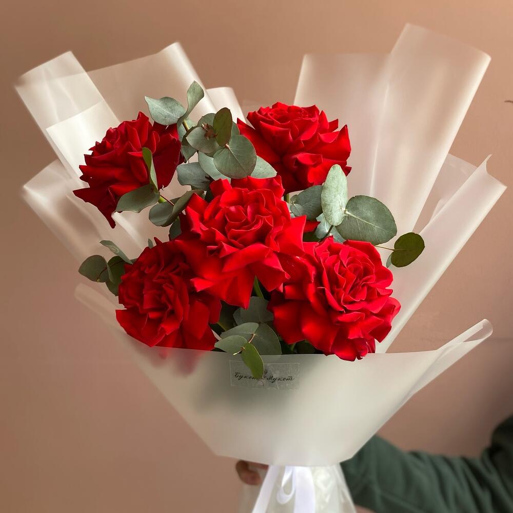 Роза красная – 5 шт.Эвкалипт – 2 шт.Лента атласная – 1 шт.Пленка матовая – 2 шт.