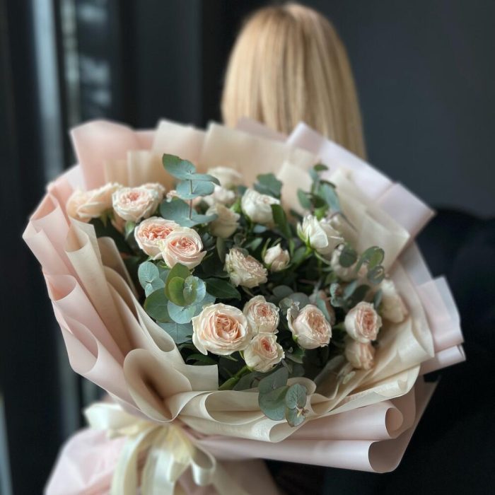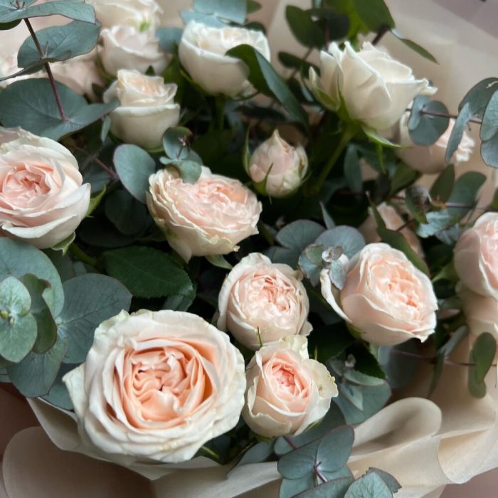 Эвкалипт – 3 шт.Кустовая роза – 5 шт.Атласная лента – 1 шт.декоративная упаковка – 3 шт.