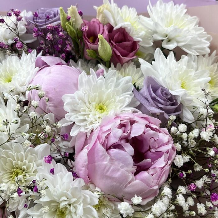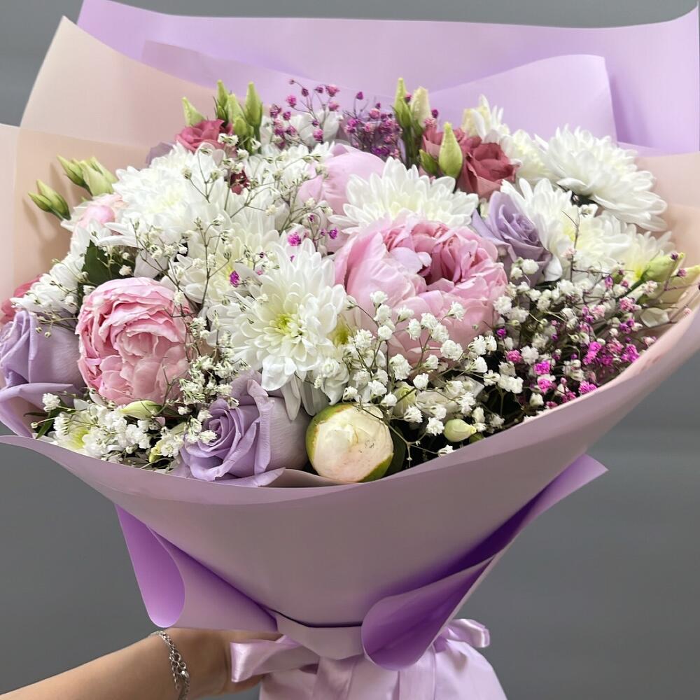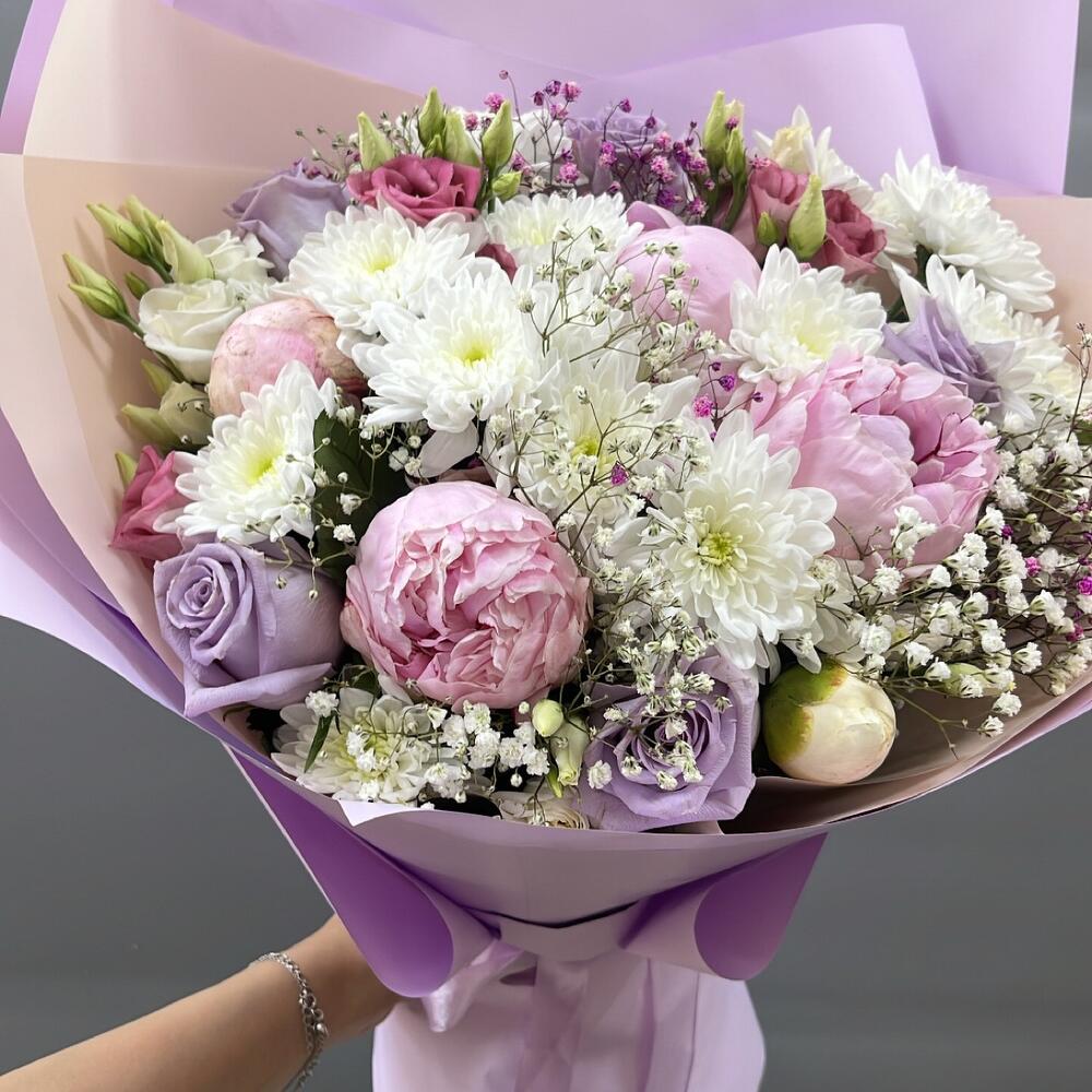 Хризантема кустовая – 3 шт.Пион – 4 шт.Роза – 5 шт.Эустома – 5 шт.Гипсофила – 3 шт.Оформление – 1 шт.