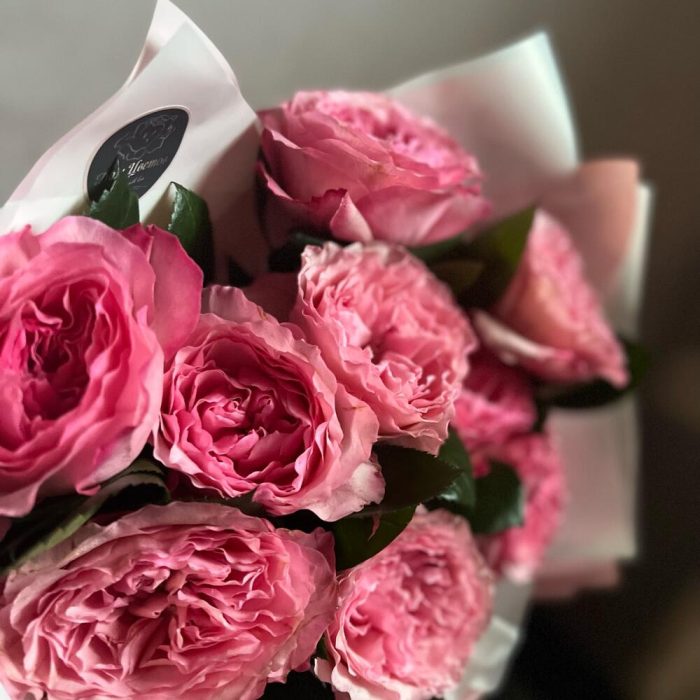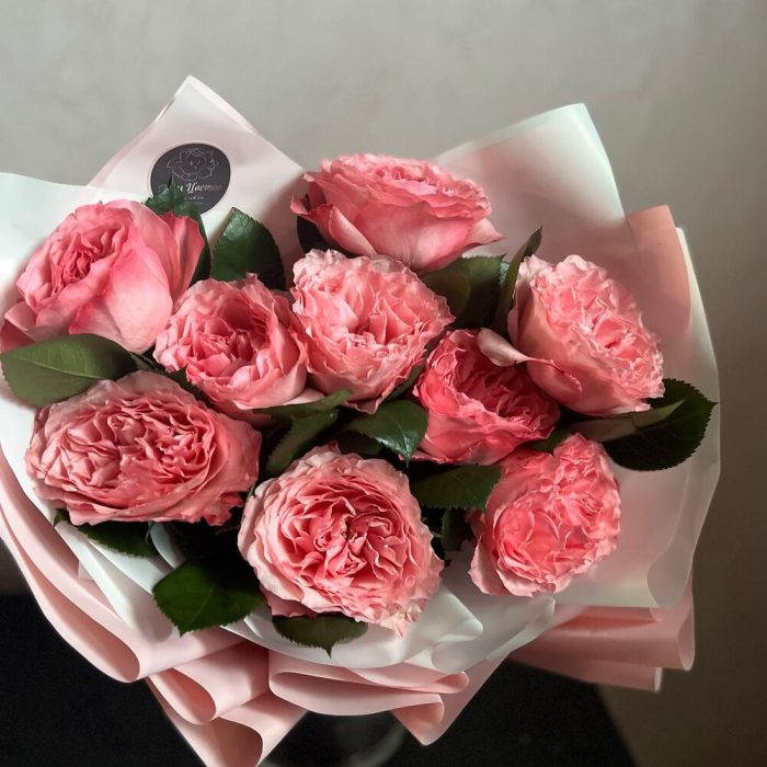 Атласная лента – 1 шт.декоративная упаковка – 1 шт.пионовидная одноголовая роза mayra pink – 9 шт.