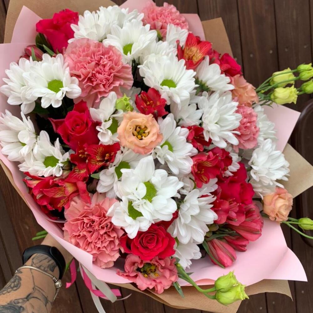 Хризантема кустовая – 5 шт.Роза – 5 шт.Альстромерия – 5 шт.Эустома – 1 шт.Гвоздика – 4 шт.Упаковка дизайнерская – 2 шт.Лента атласная – 1 шт.