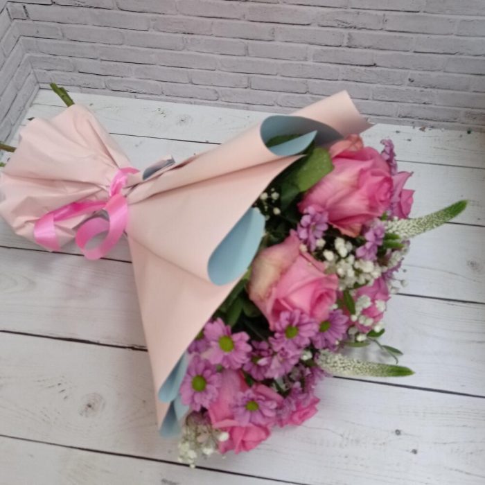 Букет из розовых роз, альстромерии и зелени «Матильда»