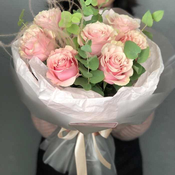 Эвкалипт – 2 шт.Упаковка дизайнерская – 2 шт.Ковыль – 1 шт.пинк мондиаль роза – 7 шт.