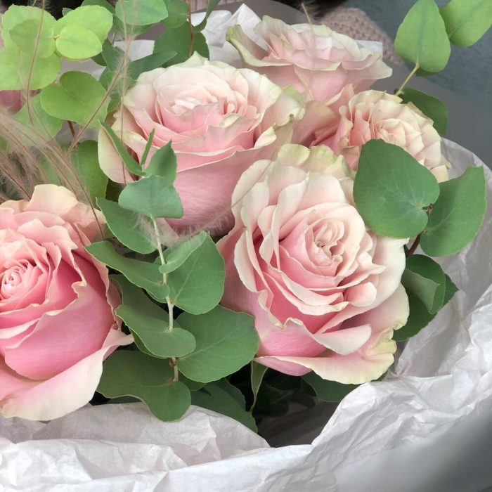Букет роз « Пинк мондиаль» и эвкалипта