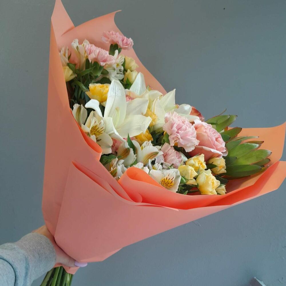 Категорий: Альстромерии, Гвоздики, Кустовые розы, Лилии, Пионовидные розы, Розы