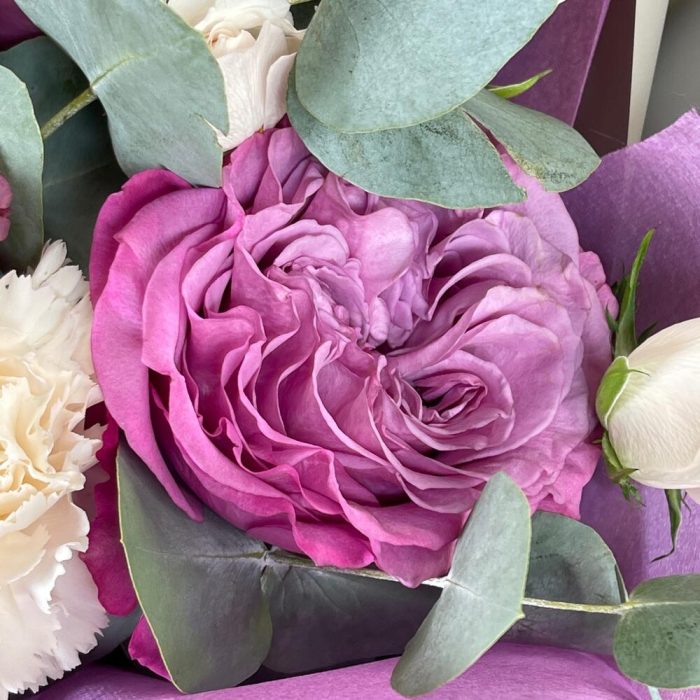 Лента – 2 шт.Лизиантус – 1 шт.Роза кустовая – 2 шт.Эвкалипт – 2 шт.Эрингиум – 1 шт.Роза одноголовая – 3 шт.Упаковка дизайнерская – 2 шт.Гвоздика одноголовая – 1 шт.