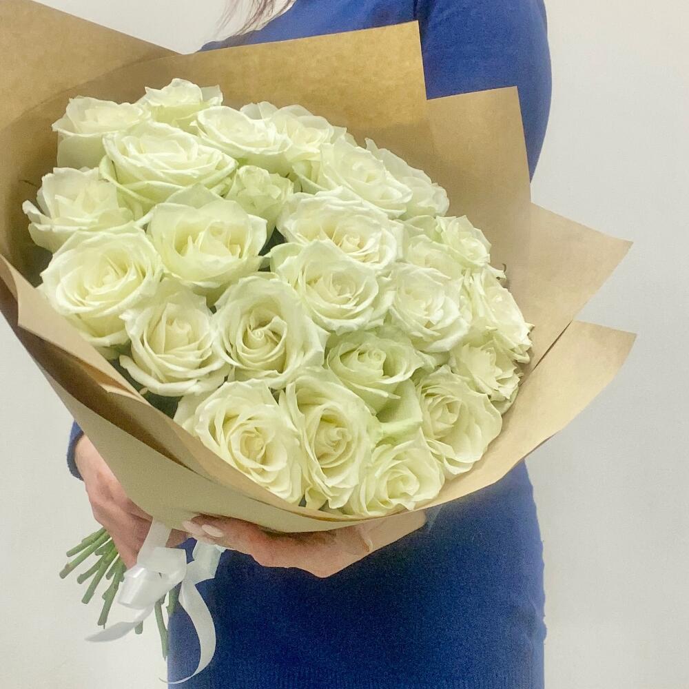 Роза белая – 25 шт.Упаковка крафт – 1 шт.Лента – 1 шт.