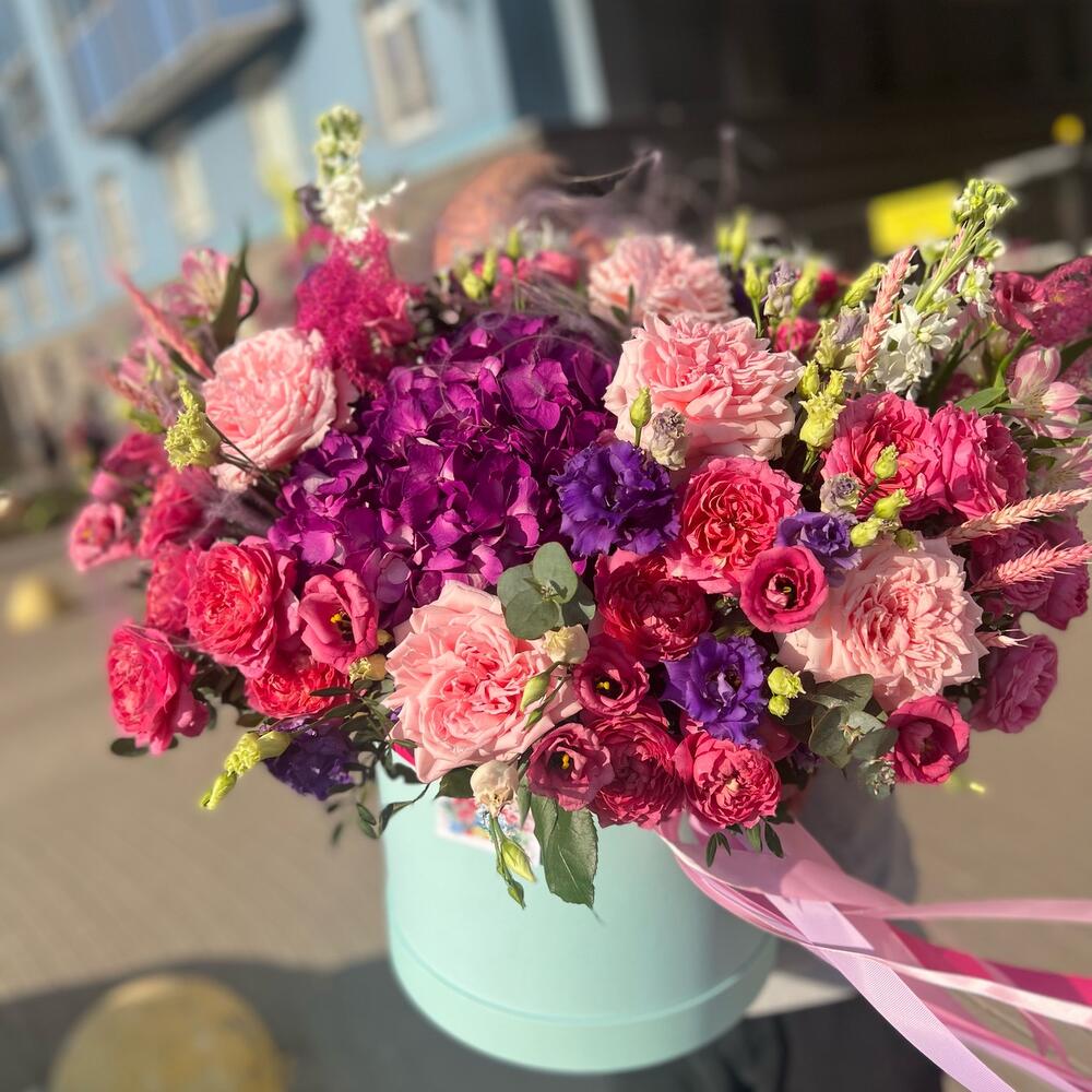 Цветы в коробке с гортензией,пион розами,маттиолой,альстромерией,эустомой,колосьями пшеницы и эвкалиптом