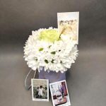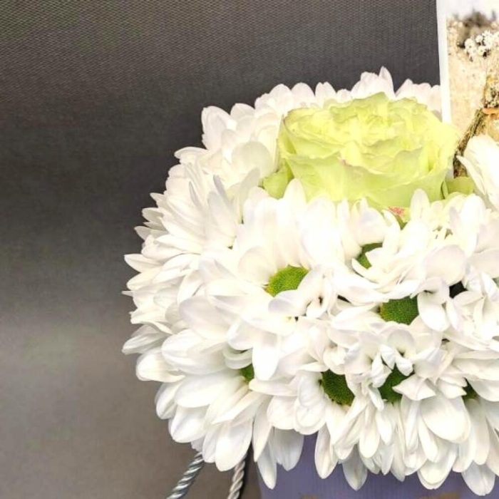 Нежная композиция в шляпной коробке с ромашкой и пионовидной розой.