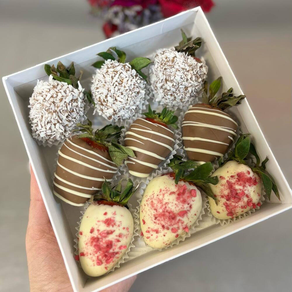 клубника в бельгийском шоколаде – 9 шт.Стакан для цветов – 1 шт.роза красная кения – 3 шт.лимониум сухоцвет – 1 шт.Зелень – 1 шт.Флористическая губка – 1 шт.