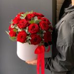 Эвкалипт – 4 шт.Лента атласная – 2 шт.Коробка шляпная – 1 шт.Оазис флористический – 1 шт.роза ред наоми. – 21 шт.
