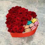 Композиция с красными розами и макарунс «Моя любовь»