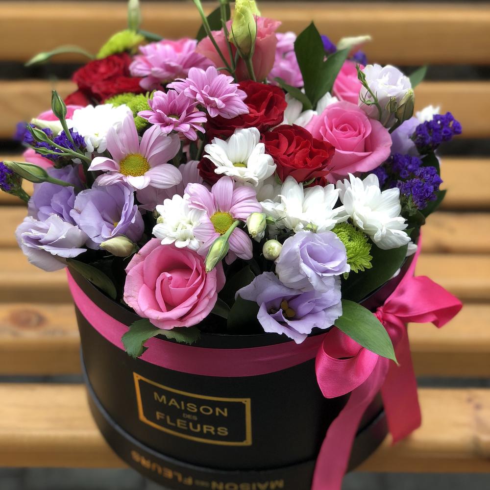 Роза розовая – 3 шт. Роза белая – 2 шт. Роза кустовая красная – 2 шт. эустома фиолетовая – 3 шт. Коробка подарочная с крышкой – 1 шт. Хризантема Кустовая Бакарди белая – 3 шт. Хризантема розовая бакарди – 2 шт. зелень декоративная – 5 шт.