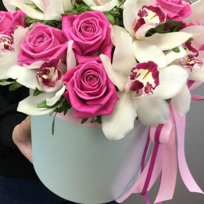 Композиция в шляпной коробке с орхидеями и малиновой розой “Малинка”, размер L