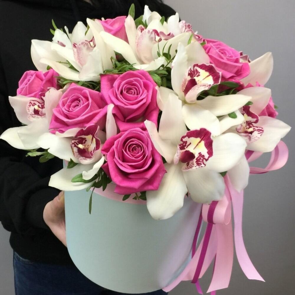 Орхидея Цимбидиум – 10 шт.Роза – 11 шт.Лента атласная – 1 шт.Шляпная коробка – 1 шт.Губка флористическая – 2 шт.зелень декоративная – 4 шт.